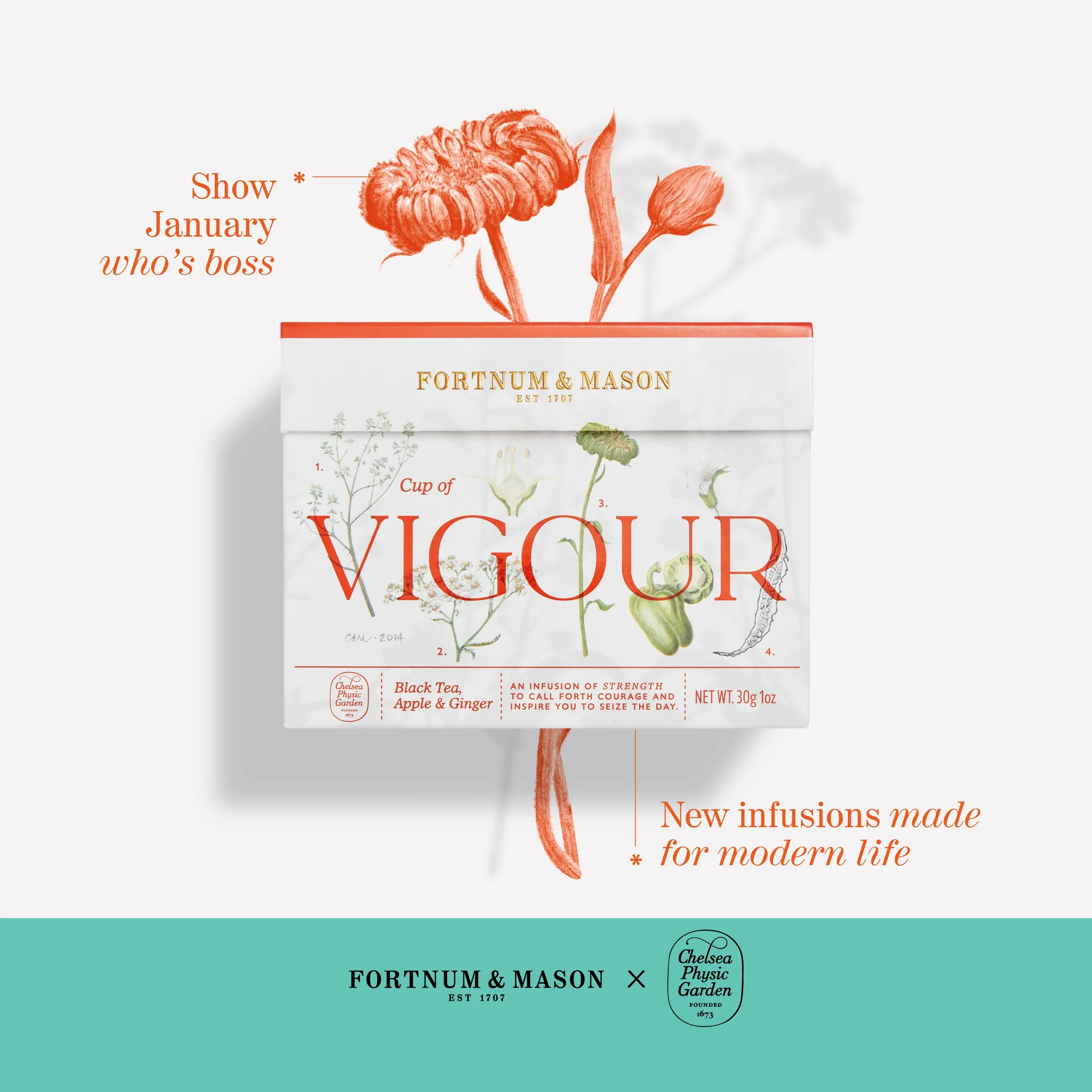 For this project, Fortnum & Mason partnered closely with Chelsea Physic Garden to refresh its wellness infusions range, drawing upon the power of plants to support mood and wellbeing.
